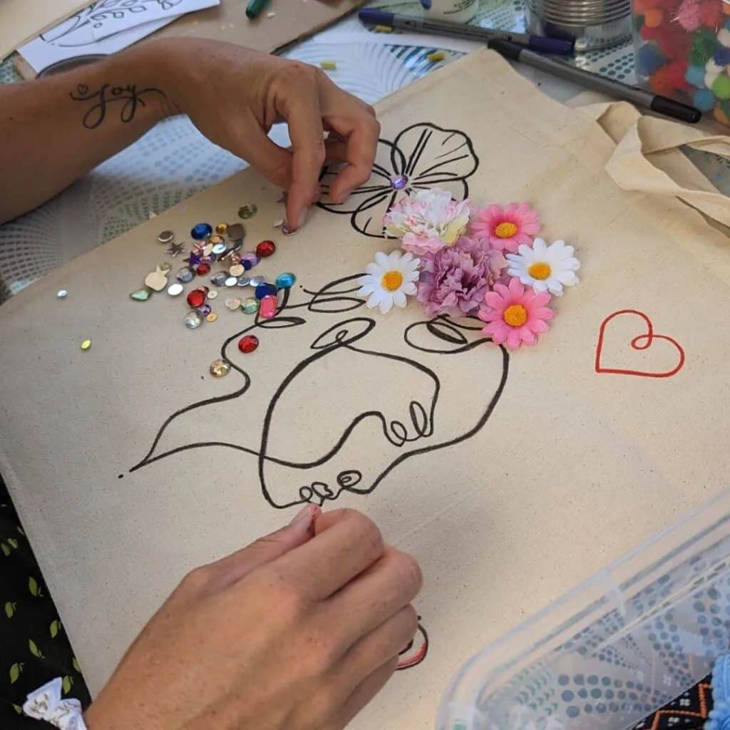 Customisation de tote bags : avec des feutres textiles, des pompons, des strass, des galons, vous pourrez personnaliser votre tote bag pour un souvenir inoubliable de la journée.