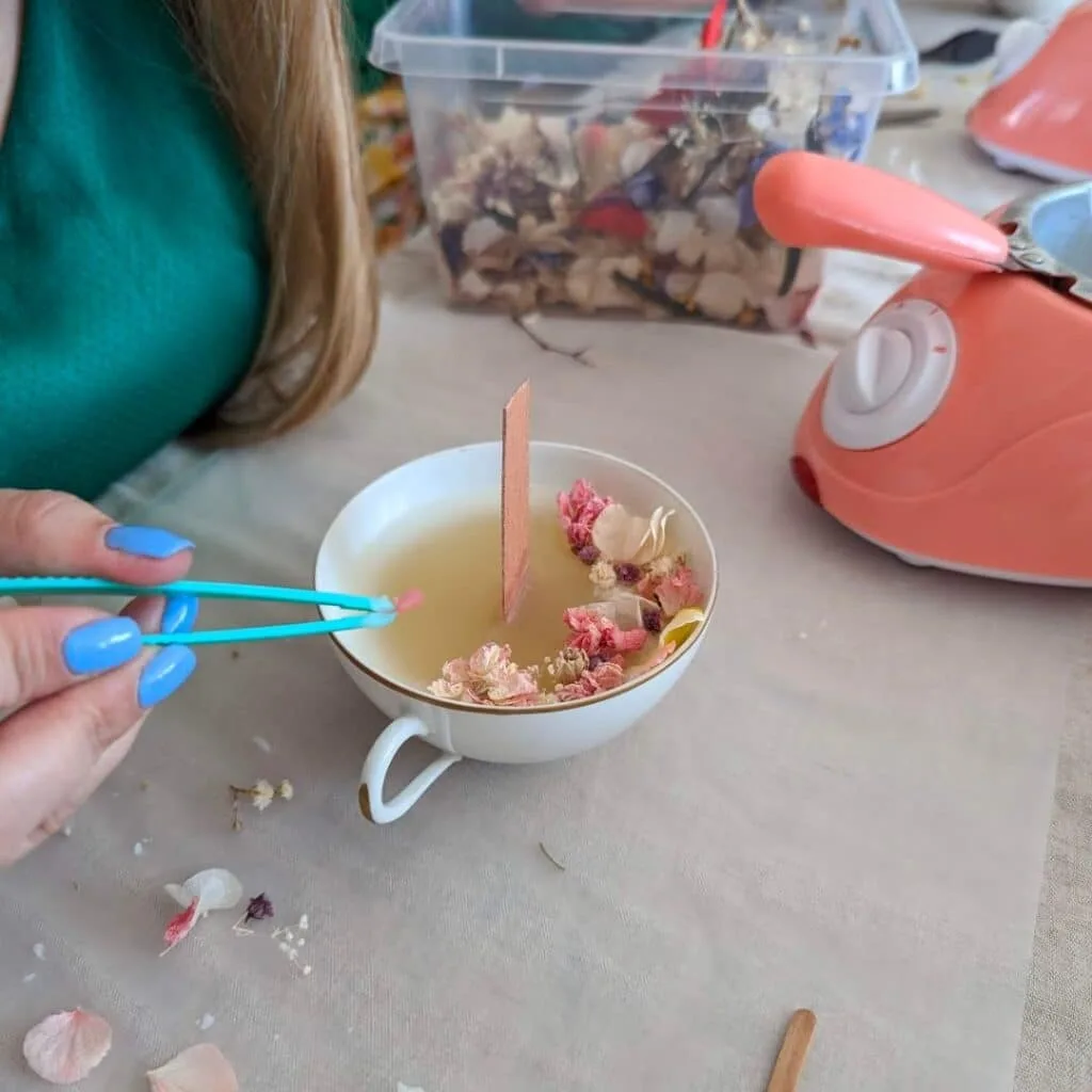 Bougies naturelles parfumées et fleuries : à partir de cire végétale, vous réaliserez de jolies bougies parfumées dans des petites tasses chinées. Elles pourront ensuite décorer les bougies de fleurs séchées.