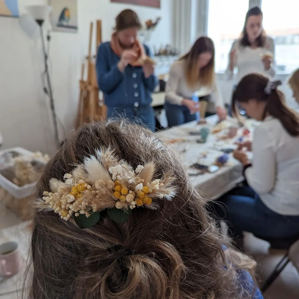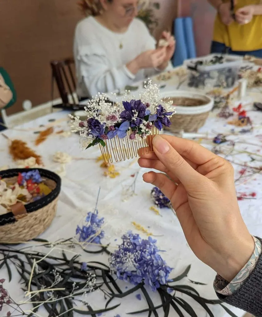 Création de bijoux fleuris ou couronne de fleurs séchées : réalisez un peigne ou un serre-tête décoré de fleurs séchées parfait pour le jour J. D’autres bijoux sont également possibles : broche, barrette, bracelet, créoles …