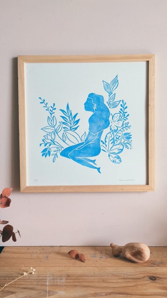 J’ai adoré la linogravure, pouvoir créer soi même son visuel, y mettre son énergie en creusant dans la matière qui reste souple et facile et découvrir à la fin sa création, une fois la peinture appliquée sur notre lino gomme et appliquée sur le papier. Alors on découvre notre oeuvre ce qui a un côté magique et très satisfaisant!
