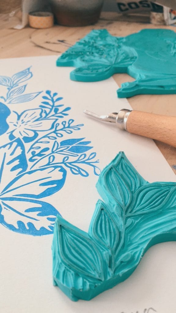Fun et créative la linogravure est une technique d’impression artisanale par laquelle nous venons graver notre dessin dans une plaque de gomme (linoleum) avant de l’encrer puis de transférer l’image gravée sur papier.