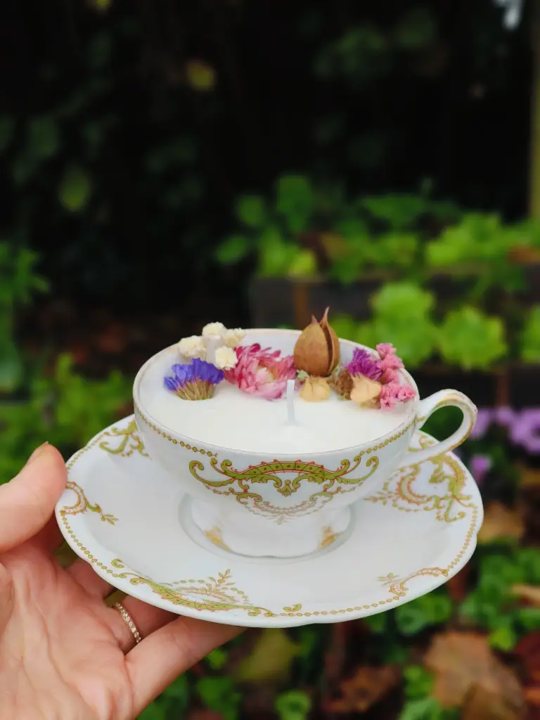 Créez votre bougie artisanale à base de cire naturelle et de fleurs séchées cultivées par mes soins. Chaque participant réalise une bougie parfumée dans une tasse vintage chinée.