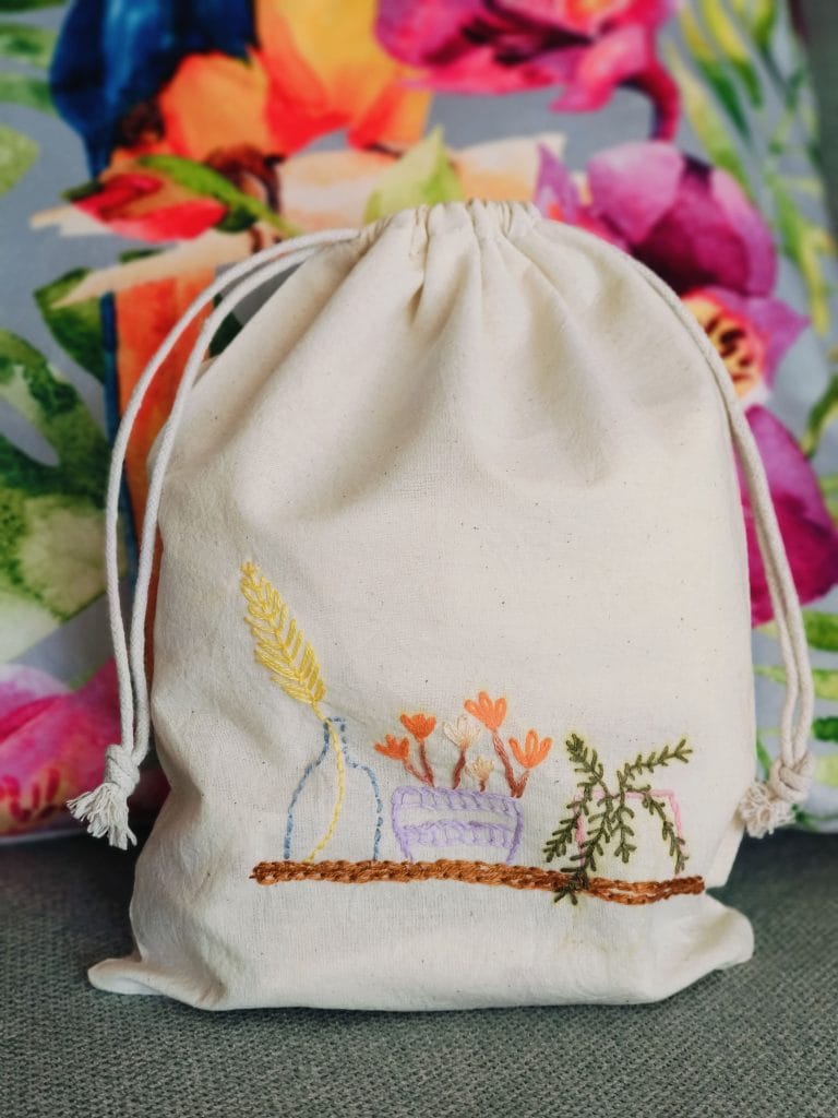 À l’aide de fil coloré, venez souligner un détail, ajouter un motif, écrire un mot, ou tout simplement laisser parler votre imagination en broderie sur un pochon en coton.