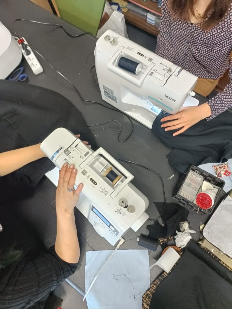 Les machines à coudre, accessoires de couture et les tissus sont mis à disposition.