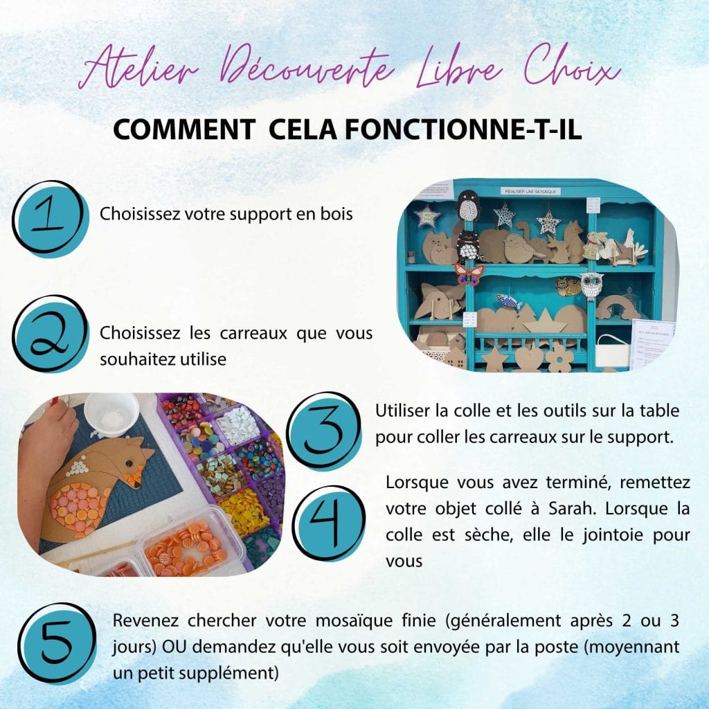 L’atelier se déroule dans une ambiance conviviale et accessible à tous, même aux débutants. Une fois votre composition terminée, elle sera confiée à Sarah, qui réalisera le jointoiement (blanc par défaut, avec possibilité de choisir une autre couleur). Votre mosaïque sera prête sous deux à trois jours. Vous pourrez la récupérer sur place ou opter pour un envoi postal moyennant un supplément.