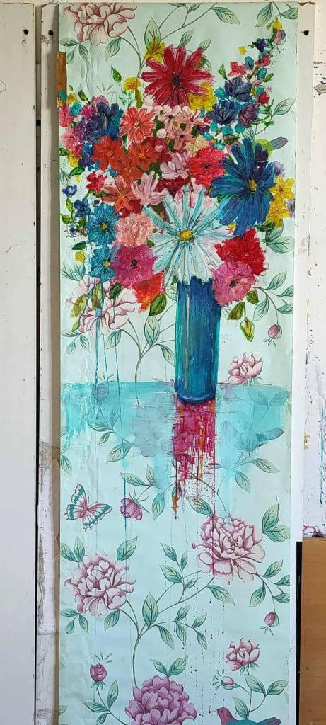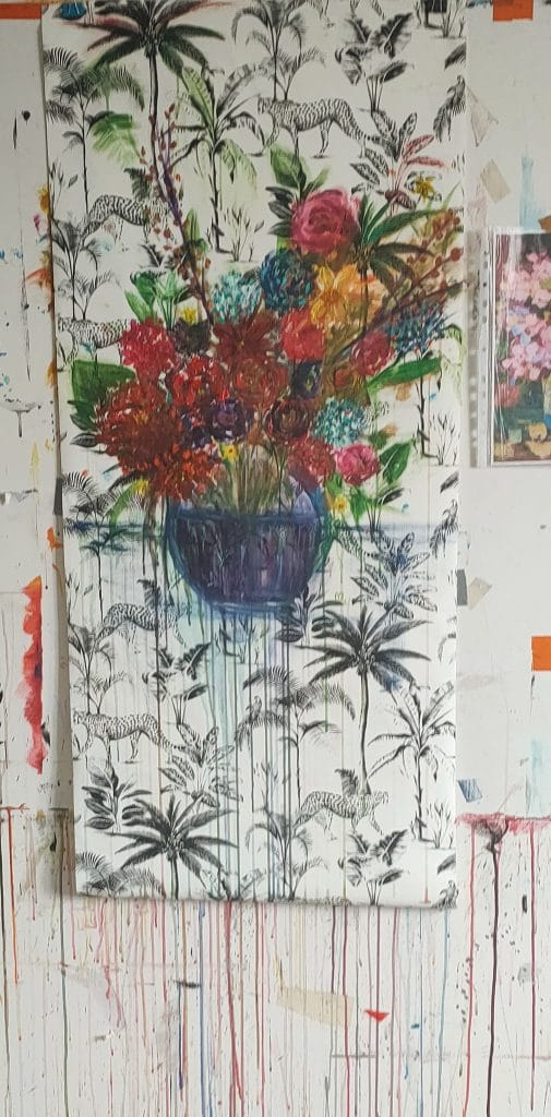 Sur un laie de papier-peint d’1m30 de H, je vous accompagne pas à pas dans la réalisation d’un bouquet de fleurs, chatoyant ou aux tons pastels .