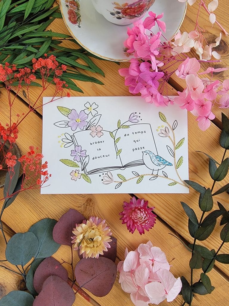 La carte à broder Maison Camomille « Broder la douceur du temps qui passe » illustre un livre ouvert orné de motifs floraux et d’un bel oiseau. La phrase positive invite à savourer chaque instant et à transformer la broderie en moment suspendu.