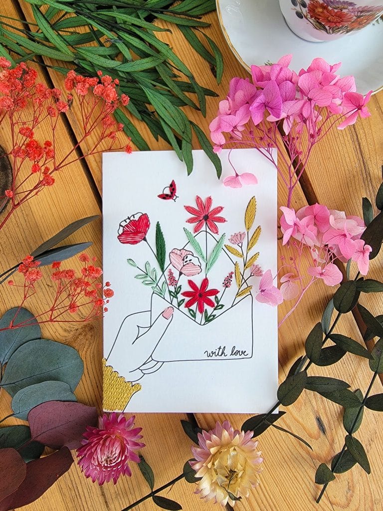Cette carte à broder Maison Camomille illustre une main tenant une enveloppe ouverte d’où s’échappent des fleurs délicates et une coccinelle porte-bonheur. Avec son message « With love », elle devient un cadeau fait main, idéal pour un anniversaire, Noël ou une fête des mères.