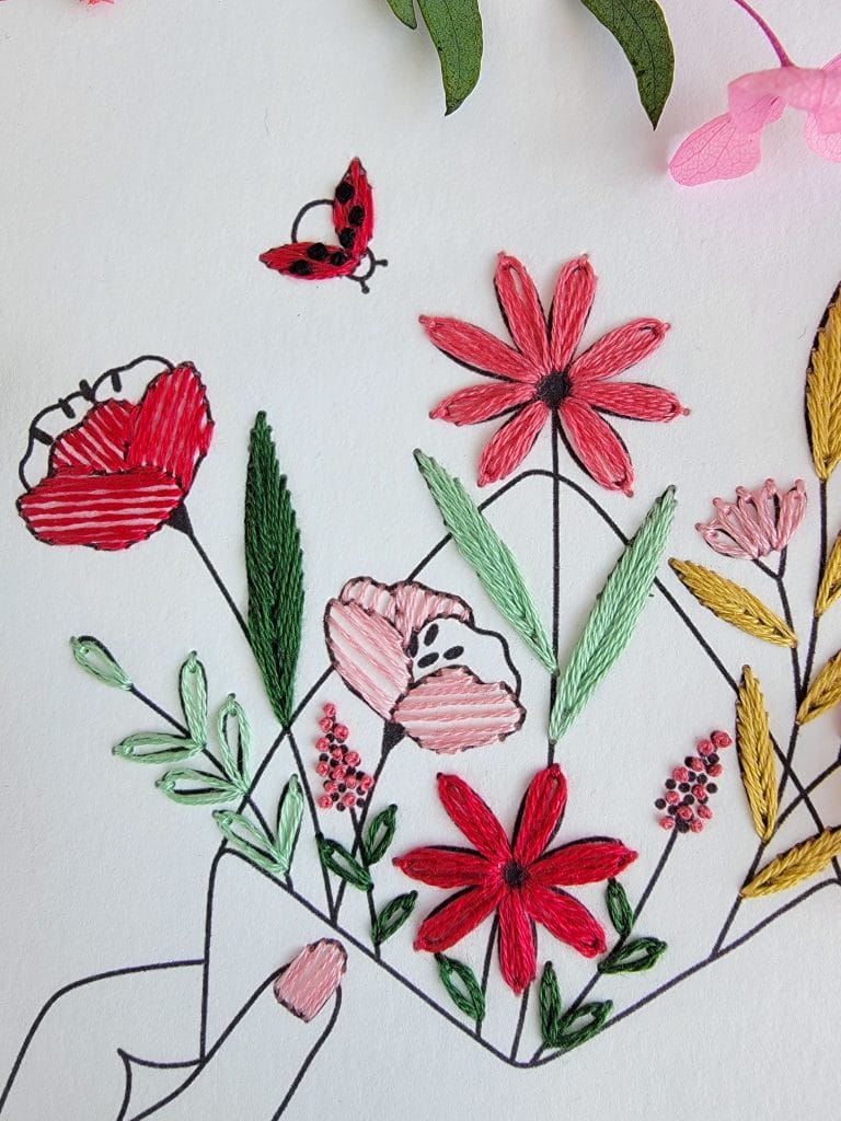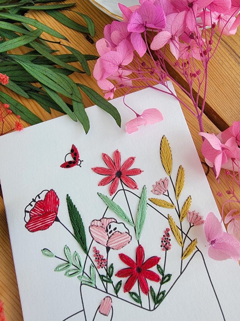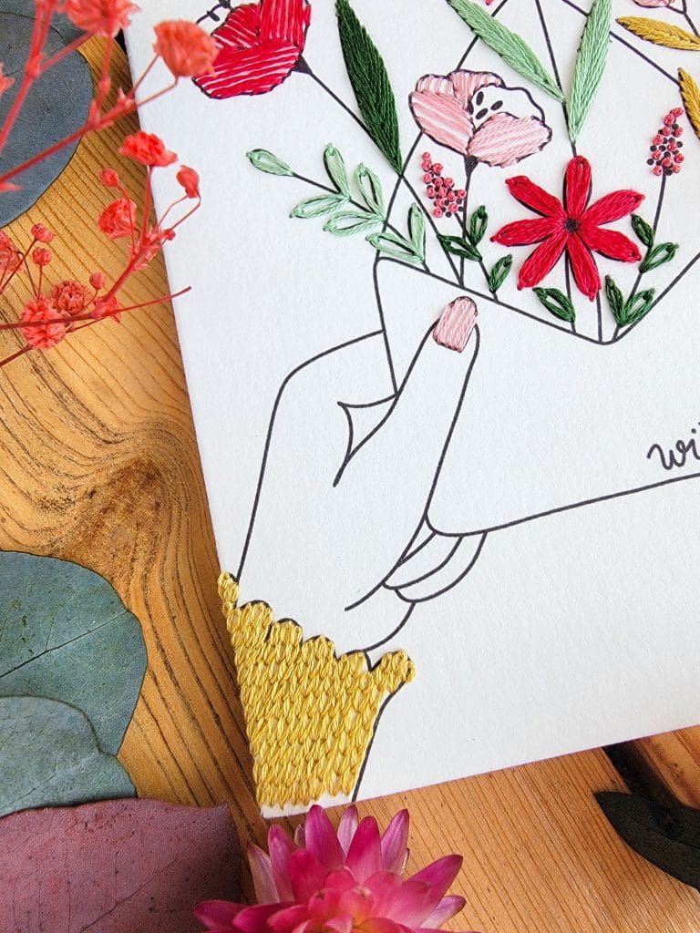 Pas de patron imposé : laisse libre cours à ton inspiration, crée les motifs de ton choix, joue avec les couleurs. Brode-la pour toi ou offre-la avec son enveloppe : une pièce faite main qui deviendra un souvenir précieux.