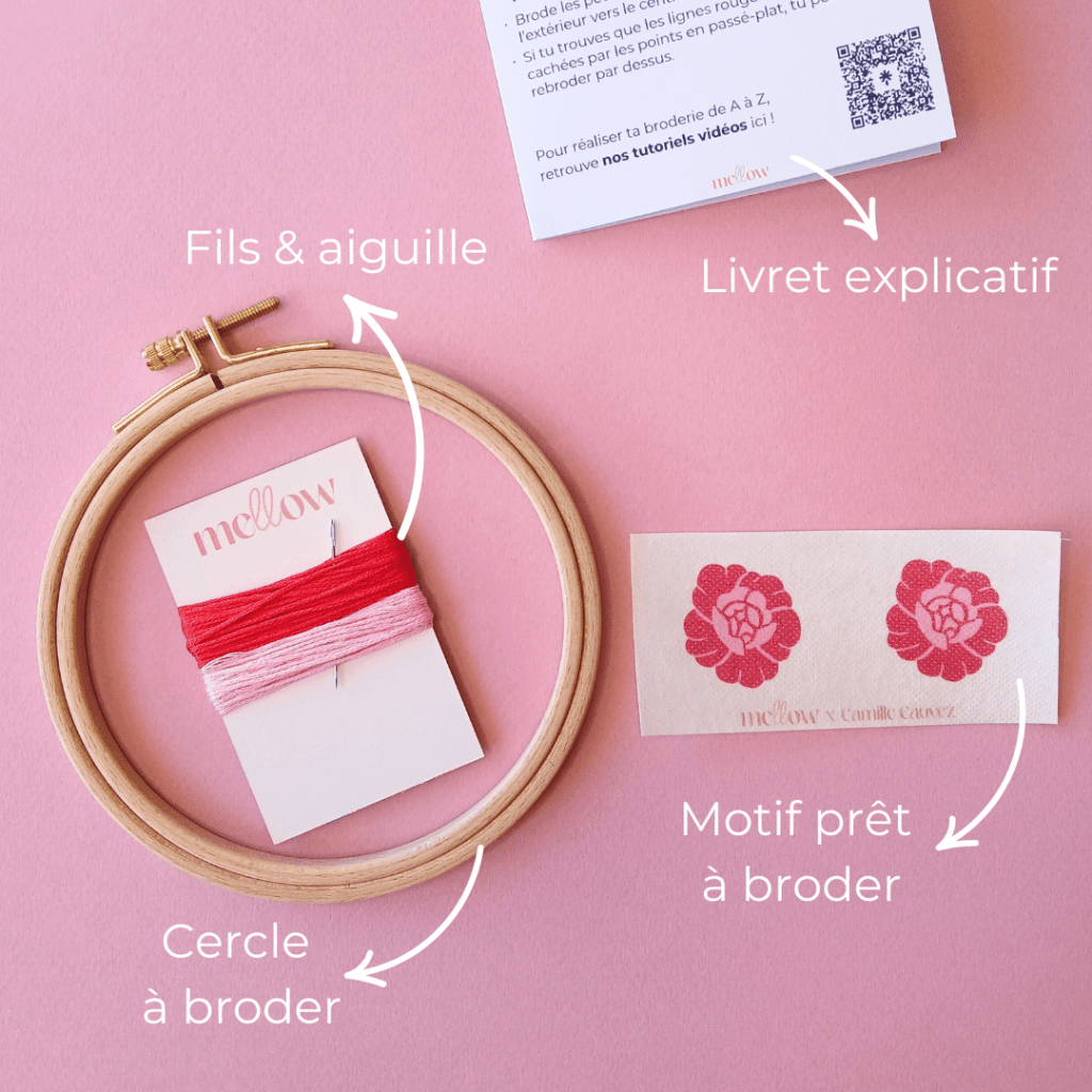 Le beau motif de ce kit de broderie a été créé en collaboration avec l’artiste Camille Cauvez.