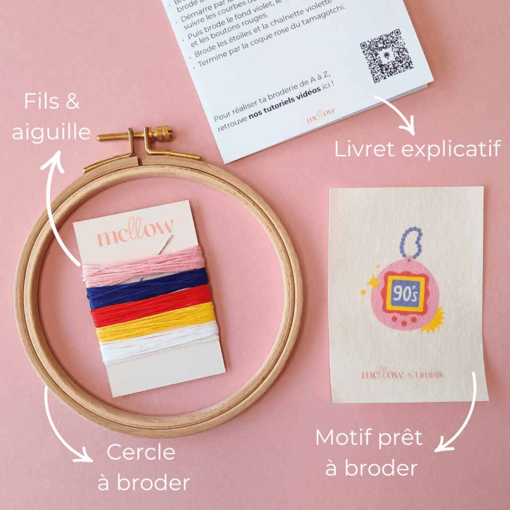 – Matériel nécessaire (Tambour, fils et aiguille en option, à choisir dans « Choisis ton kit »)