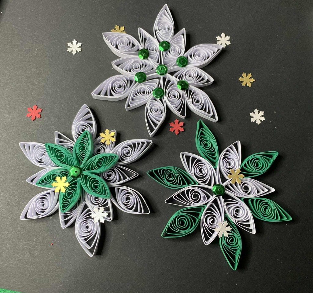 Kit DIY création en papier selon la technique du quilling à réaliser soi-même. Ce kit contient les bandes de papier, le matériel nécessaire pour réaliser 3 étoiles de Noël et une notice détaillée décrivant les étapes à suivre. Suggestion de présentation (collage facultatif des étoiles et des sequins fournis dans le kit)